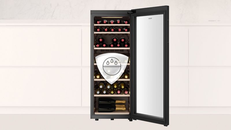 Unsere Weinkühler verfügen über eine der neuesten patentierten Technologien von Haier: das Natural Airflow System. Durch präzise Temperatur- und Feuchtigkeitssensoren arbeiten Lüfter und Kompressor zusammen, um eine perfekte Luftfeuchtigkeit zwischen 50-70% zu garantieren, wie in einer professionellen Weinkellerei. Wasser aus einem Tank am Boden der Kühlbox wird dann in Feuchtigkeit umgewandelt, und der Anti-Gravitations-Luftstrom garantiert eine perfekte Verteilung im gesamten Innenraum.