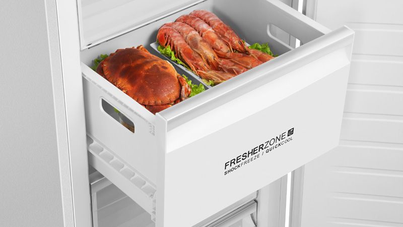 Die sehr praktische Fresher-Zone-Schublade ermöglicht das “Schockfrosten” von Gegenständen im Gefriermodus auf -26 °C in nur sehr kurzer Zeit, was dazu beiträgt, Nährstoffe einzuschließen und Bakterien zu beseitigen. Durch diesen Prozess bleiben Ihre Lebensmittel länger frisch, gesund und schmackhaft. Im Kühlmodus ist die QuickCool-Einstellung aktiviert, d. h. die Temperatur Ihrer Lebensmittel wird konstant auf 0 °C gehalten.
