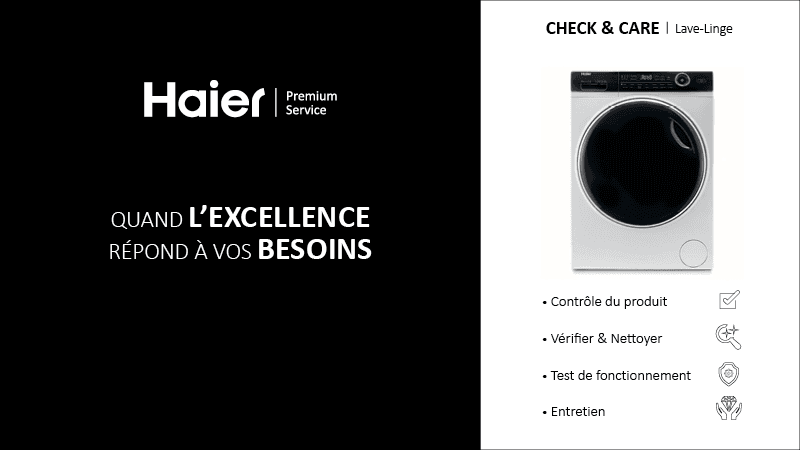Les clients Haier Premium bénéficient d'une ligne directe ouverte du lundi au vendredi de 9h00 à 20h00 et le samedi de 10h00 à 19h00. Un service de chat en ligne est également disponible pour répondre à vos questions.